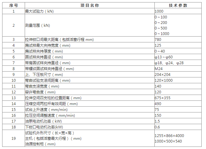 ●WE-1000A型液壓式萬能試驗機主要技術(shù)規(guī)格及參數(shù):