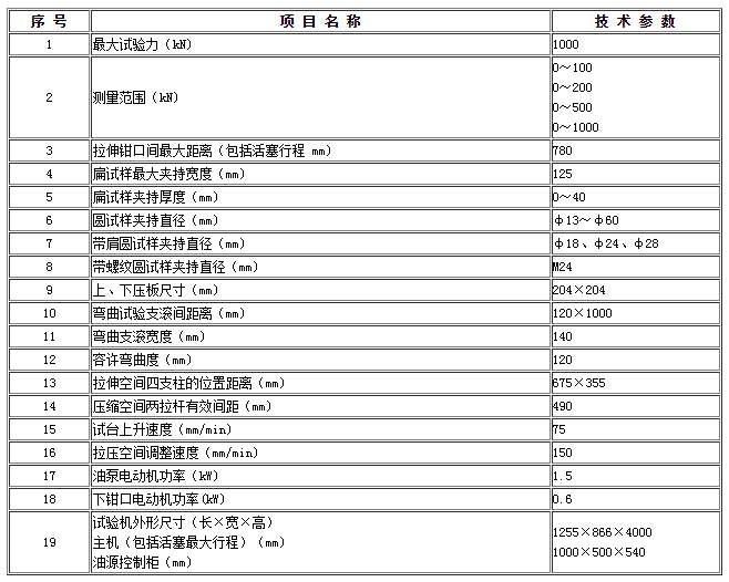 ●WE-1000A型液壓式萬能試驗(yàn)機(jī)主要技術(shù)規(guī)格及參數(shù):